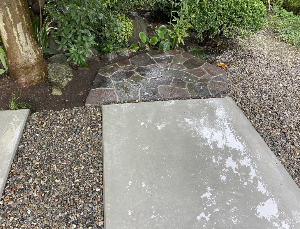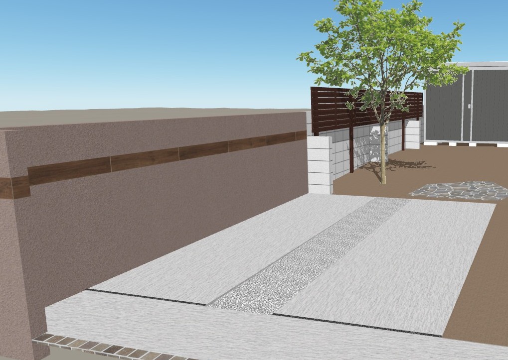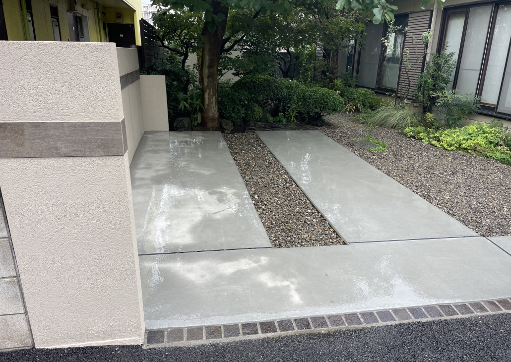 新設のコンクリートと既存のお庭のつなぎ役で