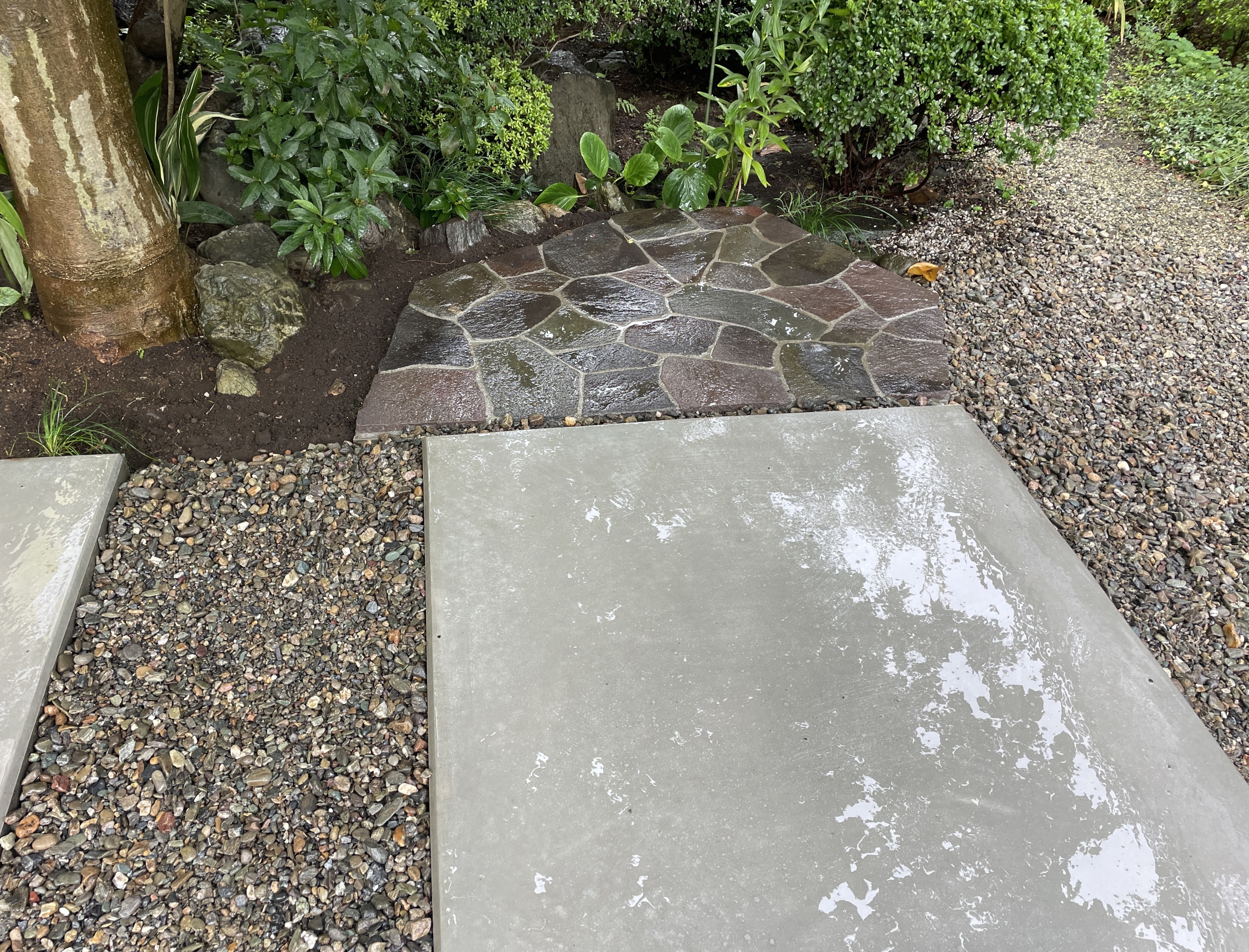 乱形石の床を作り周りには川砂利を敷きました。